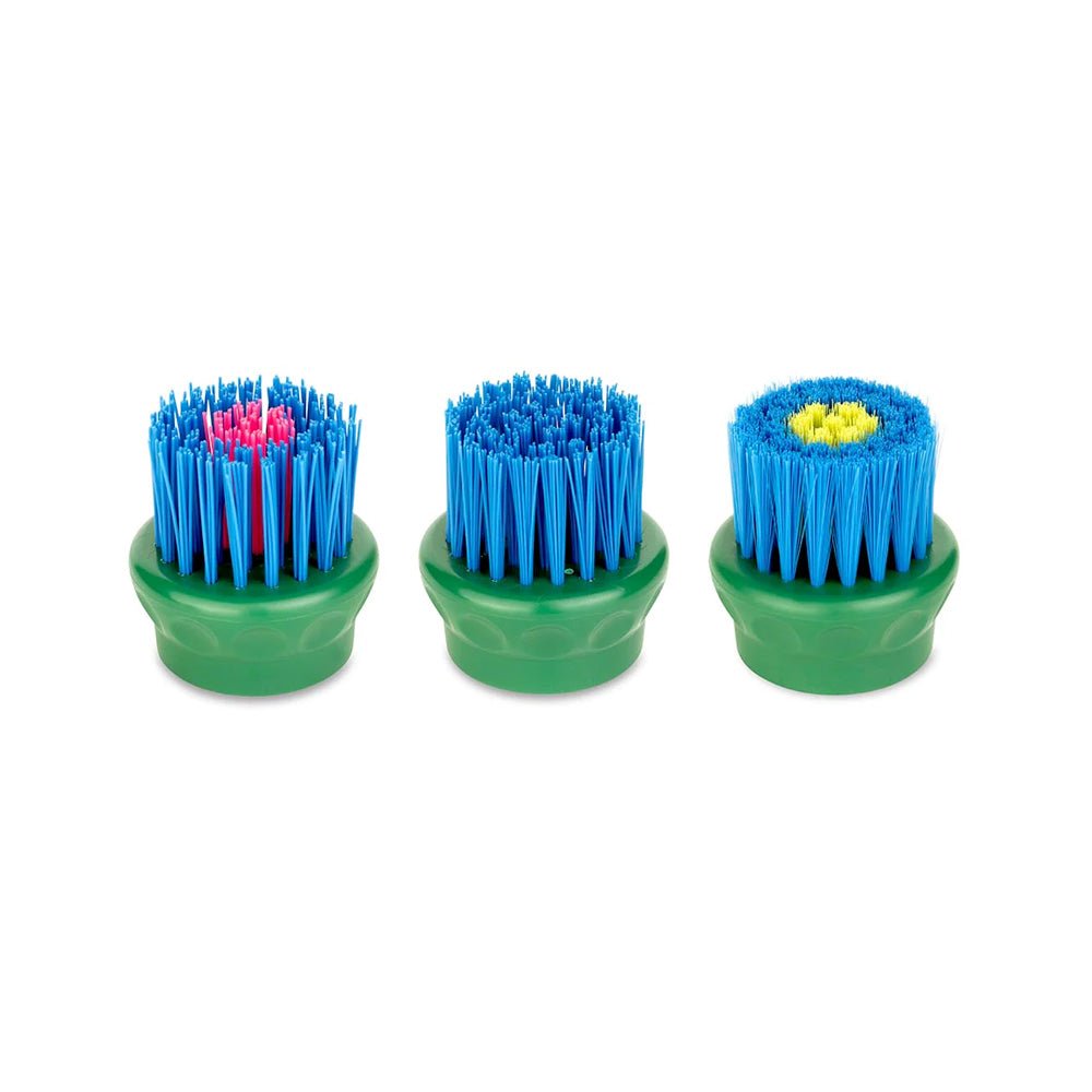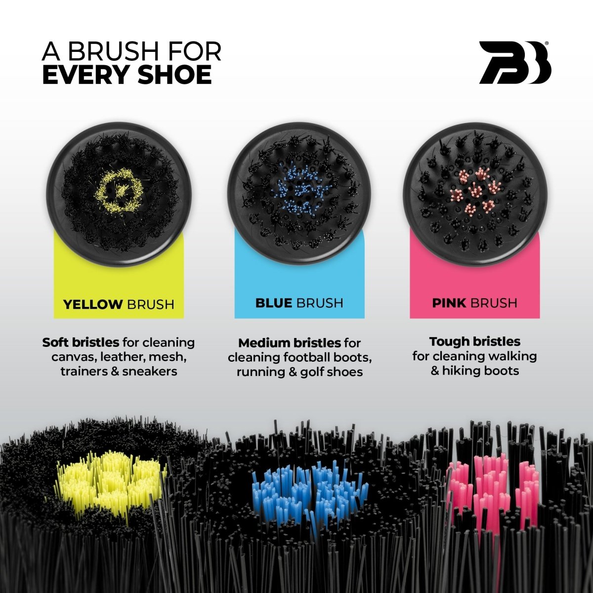 The Complete Brush Set includes 3 versatile brush heads tailored for every shoe material. The yellow brush features soft bristles, ideal for cleaning canvas, leather, and mesh trainers. The blue brush offers medium bristles for football/rugby boots, running shoes, and golf shoes, while the pink brush has tough bristles, perfect for hiking and walking boots. Quick to swap, these brush heads ensure precise shoecare for every activity.