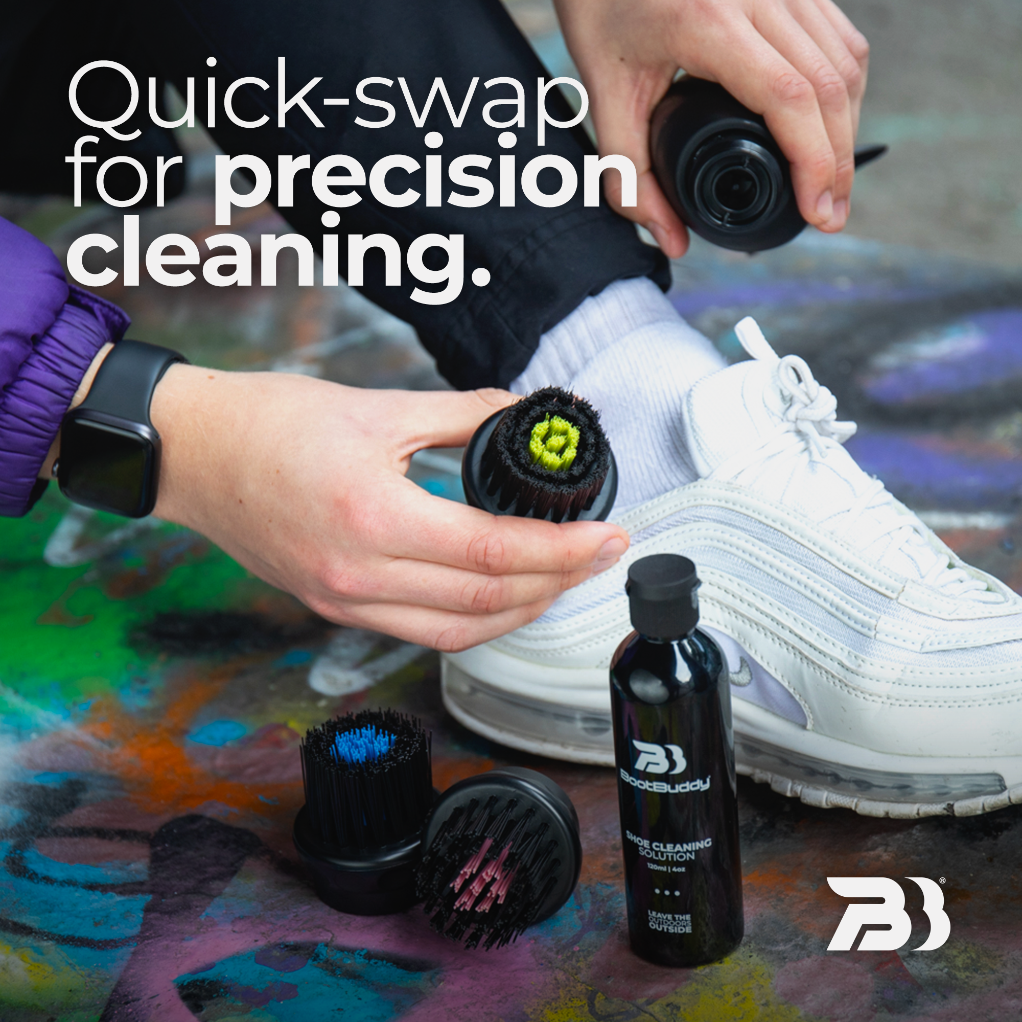 The Complete Brush Set includes 3 versatile brush heads tailored for every shoe material. The yellow brush features soft bristles, ideal for cleaning canvas, leather, and mesh trainers. The blue brush offers medium bristles for football/rugby boots, running shoes, and golf shoes, while the pink brush has tough bristles, perfect for hiking and walking boots. Quick to swap, these brush heads ensure precise shoecare for every activity.