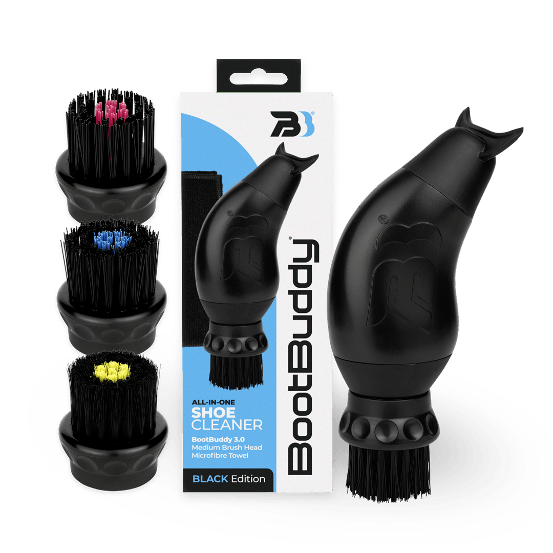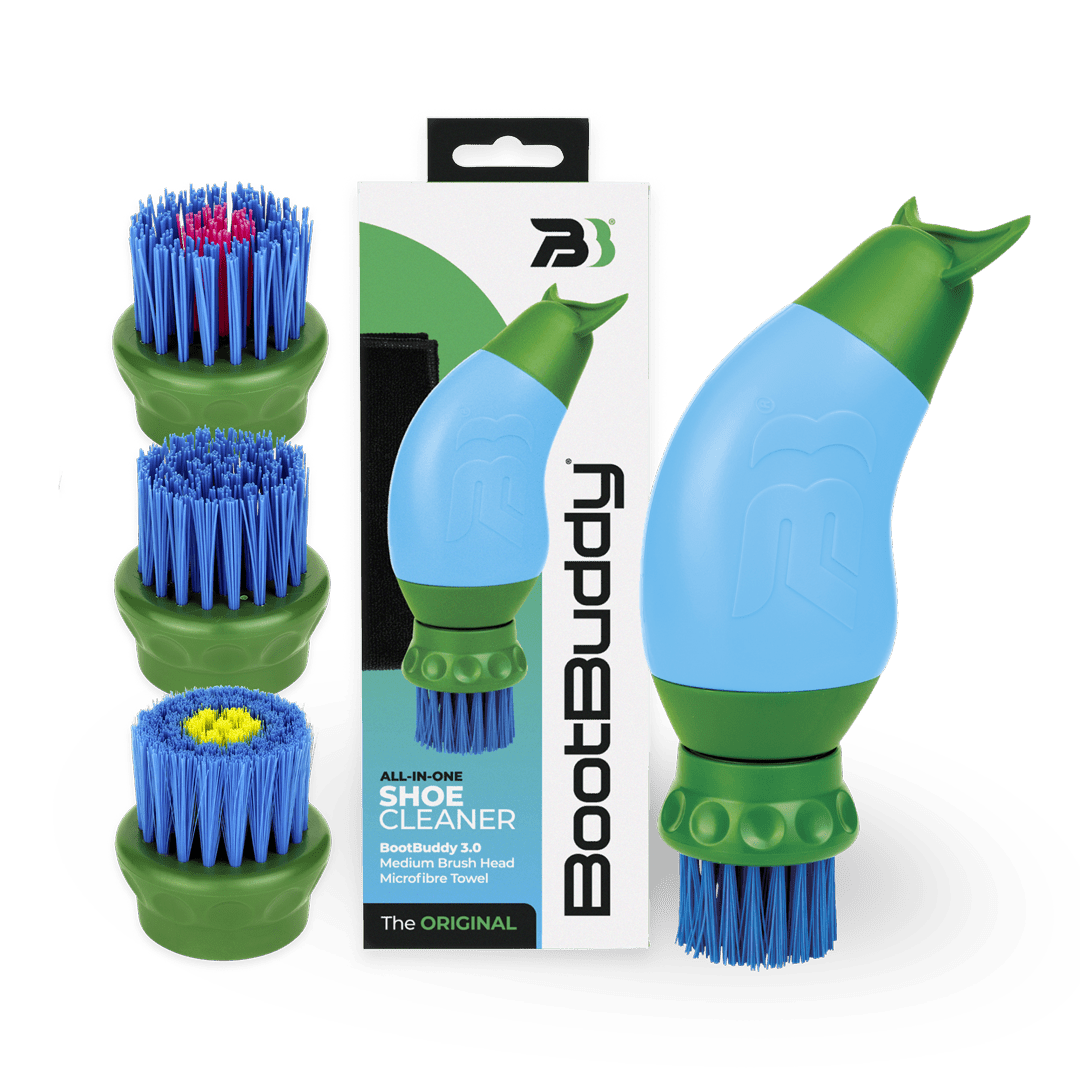 The all-in-one portable shoe cleaner — designed for muddy boots and busy lifestyles. Includes Complete Brush Set with Soft, Medium and Tough bristles for different shoe materials.